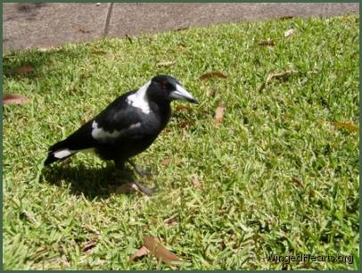 Here are some photos of my Maggie, I don’t know whether it’s a boy or a girl, but it’s very tame as it eats out of my hand. When it’s had enough mince, it gathers a big ball of mince up & runs across the yard to hide the ball for later on….just in case it gets hungry I guess!